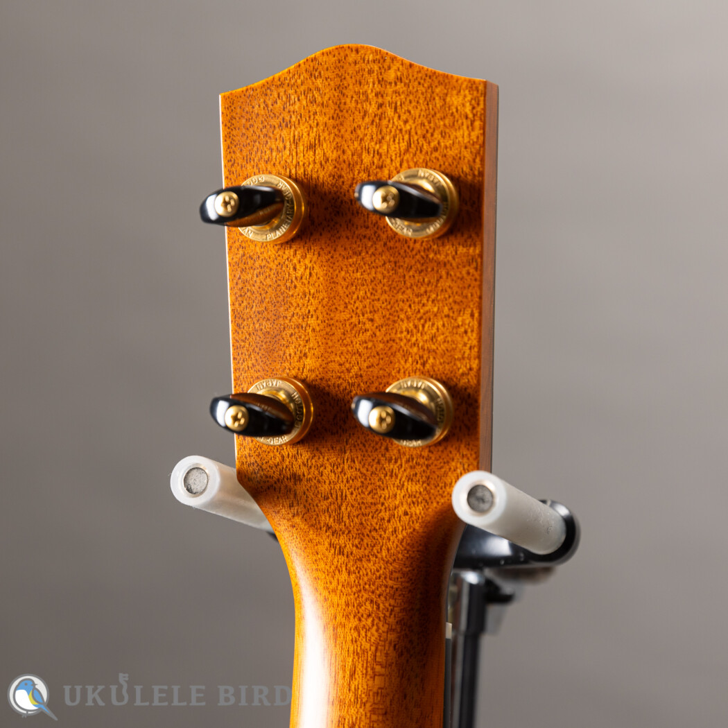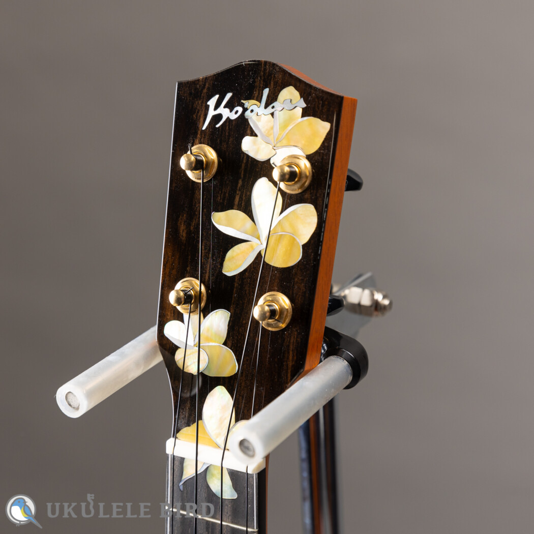 ヘッド突板:エボニー、黄蝶貝と白蝶貝で入れられたプルメリアのインレイ
